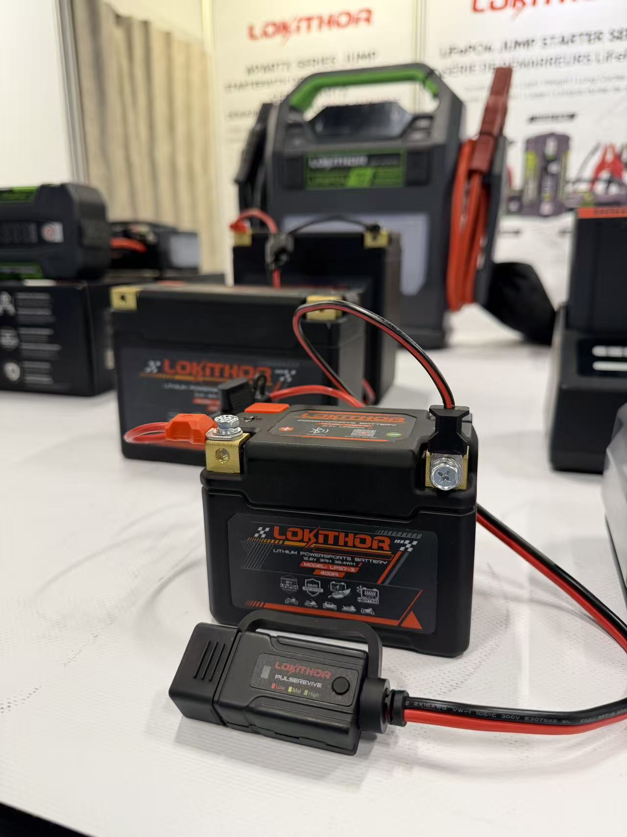 New addition to the booth this year: our Lithium Powersports Battery line. These are direct replacements for lead-acid batteries in motorcycles, ATVs, snowmobiles, and other powersports vehicles. Lighter, longer-lasting, and they hold charge much better during off-season storage. The unit shown here also includes our PulseRevive feature for battery maintenance.